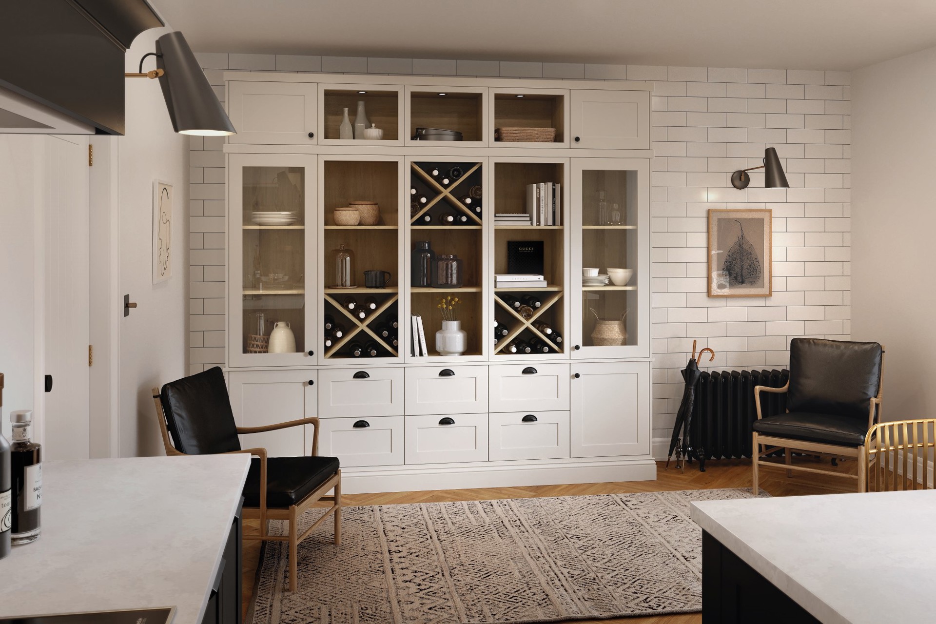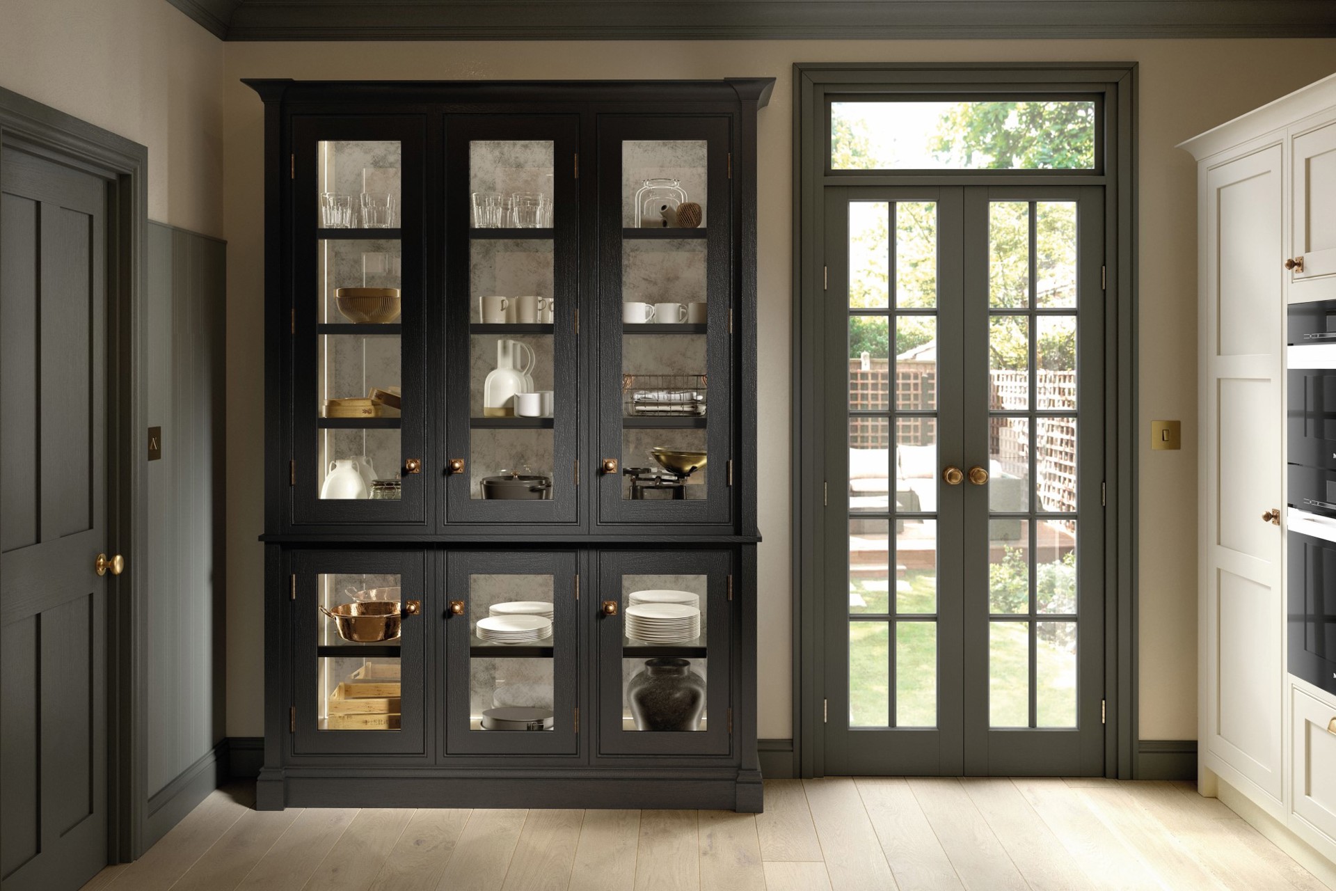 the kitchen space - such as glass dressers, drinks cabinets and shelving