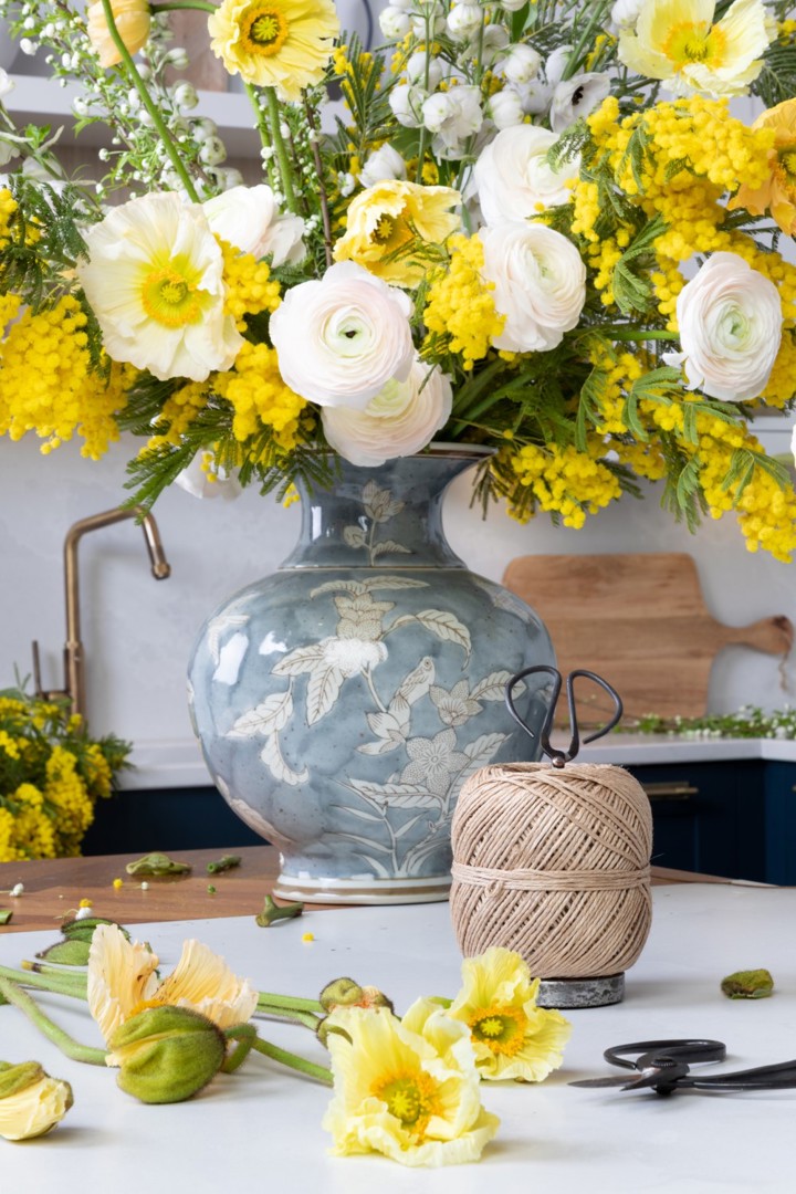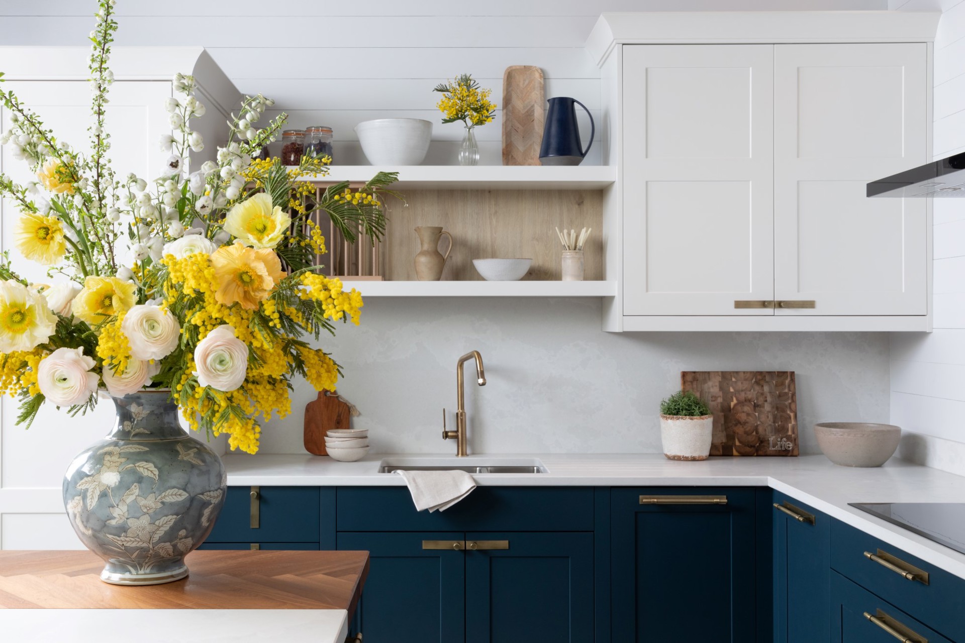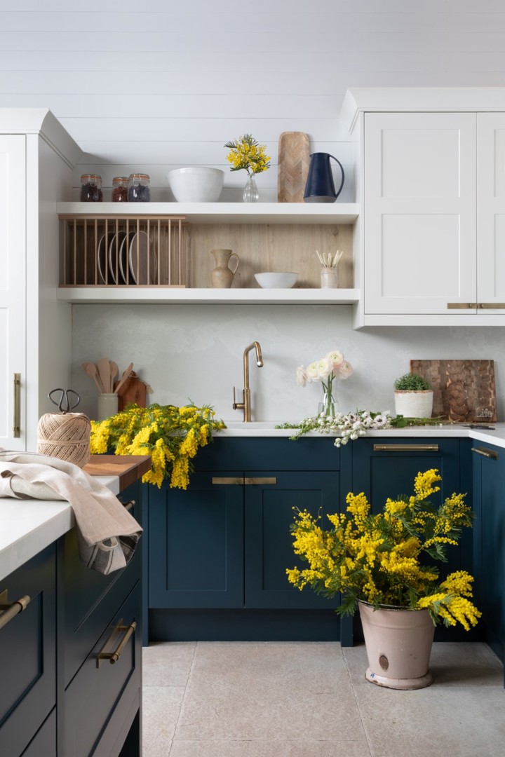 wonderful contrast against the rich blue cabinetry. Your choice of vase is